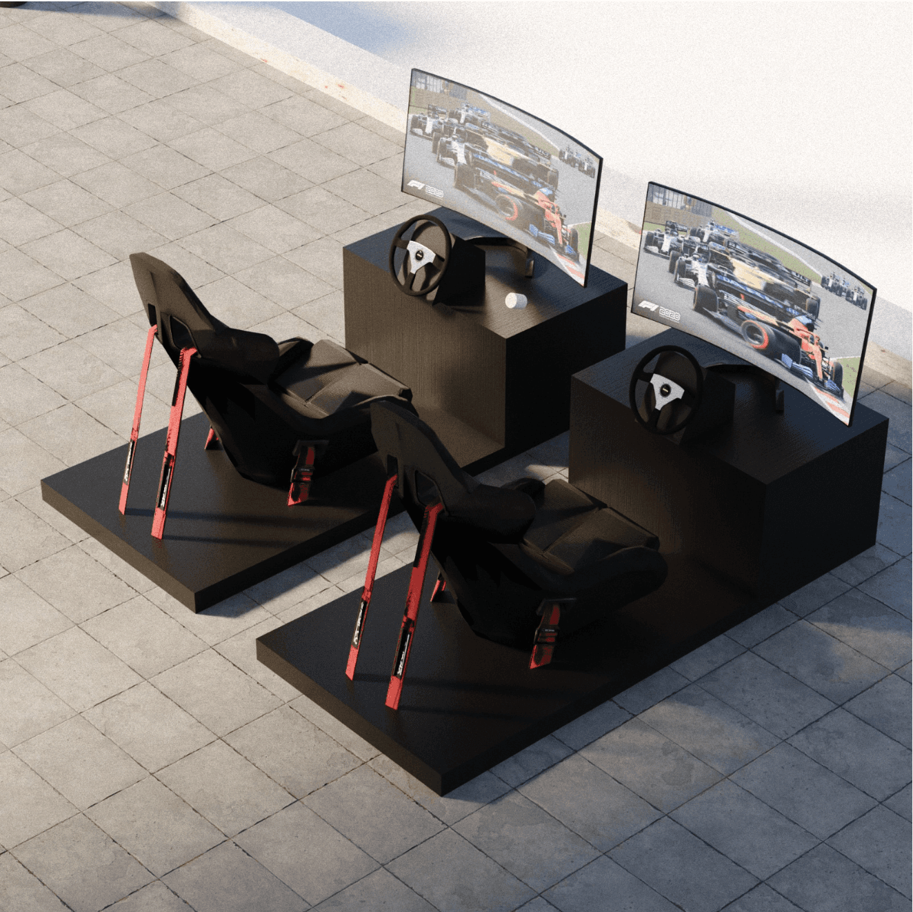 An adrenaline-charged zone where competition takes center stage—authentic racing seats with bold red seat belts lock guests into the experience while precision steering wheels put them in full control. Monitors deliver every turn and straightaway in vivid detail, immersing both serious racing enthusiasts and thrill-seeking guests in the intensity of Formula 1. The sleek black and gray aesthetic sharpens the focus, stripping away distraction and amplifying the raw, competitive energy of the track.